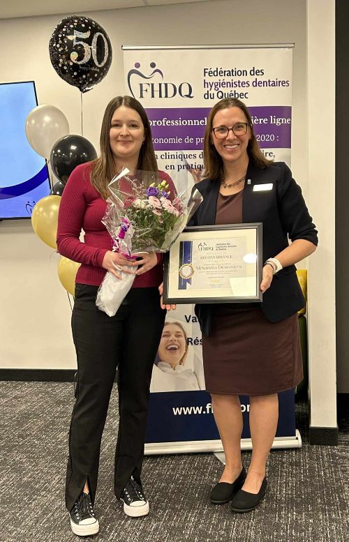 La Fédération des hygiénistes dentaires veut encourager et soutenir les étudiants finissants en Techniques d’hygiène dentaire. L'équipe du conseil d'administration a donc créé la Bourse FHDQ cette année. Celle-ci, d'une valeur de 750 $, est offerte à un (1) lauréat ou une lauréate qui a su démontrer son engagement dans son parcours académique. L’objectif visé par cette marque de reconnaissance est de valoriser la relève et promouvoir l’engagement envers sa profession.