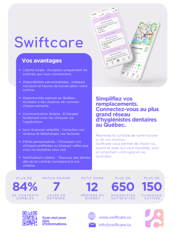 Grâce à des plateformes comme Swiftcare, le remplacement devient simple et sécuritaire. L’application met en lien des cliniques fiables et des hygiénistes qualifiées, tout en assurant un suivi professionnel et transparent à chaque étape.